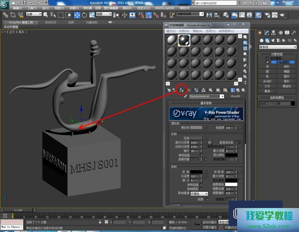 第4步点击【材质编辑器】,弹出材质编辑器修立栏,抉择一个新材质球,点击【standard】-【VRayMlt】,按图示参数修立一个银色材质球并附加给模子(如图所示);