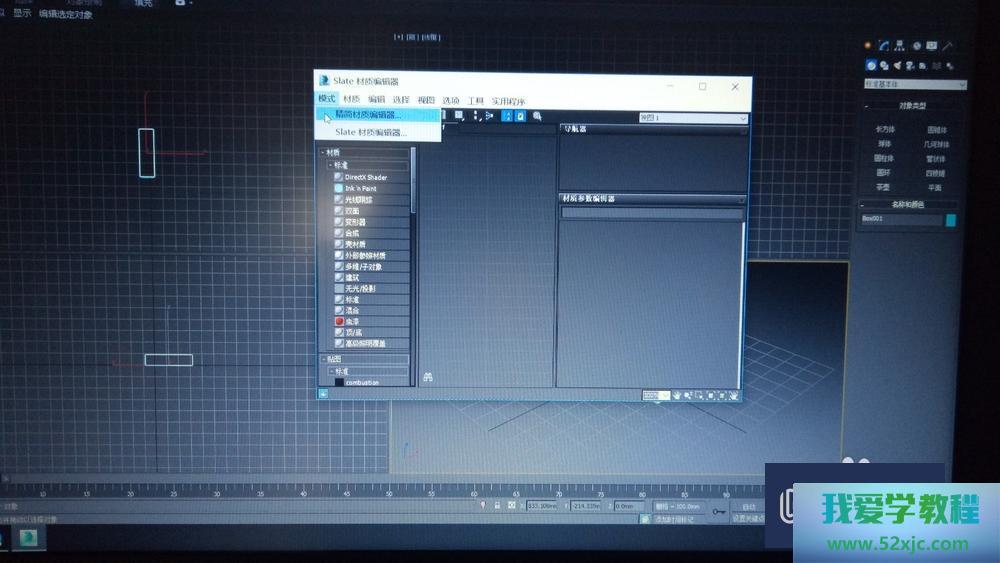 第2步遴选材质,火速键M,材质编辑器可能改成精简形式,将第一个材质拖到长方体上。
