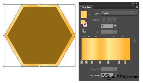 为六角边框操纵一个线性渐变(急促键G)。渐变面板的颜色变革从左到右递次是: