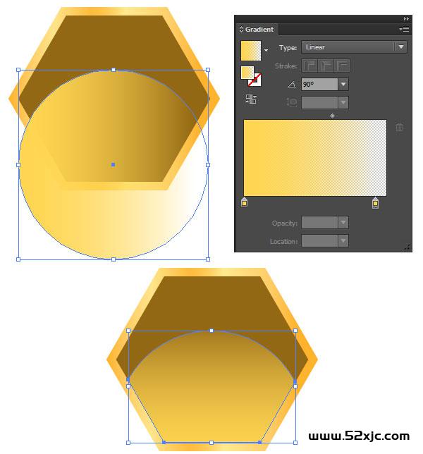 用椭圆器材(L)遮盖六边形的下半个人,用颜色(R=255G=214B=82)不透后度从100%到0%拉一个90°的线性渐变。选拔内六边形和圆,用式样天生器材(Shift-M)选拔没有遮盖内六边形的那一个人圆,消除选拔并删除,一个了解的半圆映正在蜂巢上。