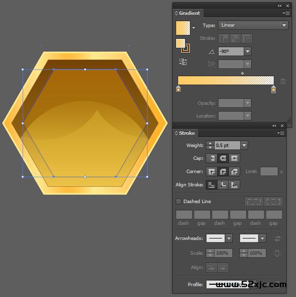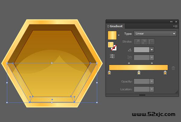 用矩形器材(M)正在暗黄色六边形的下面三条边上画出三个矩形,用直接选拔器材(A)拖动一个角使其与六边形的角度相像。操纵R=255G=189B=63到R=255G=234B=144的线性渐变,将各式样的不透后度减至42%。