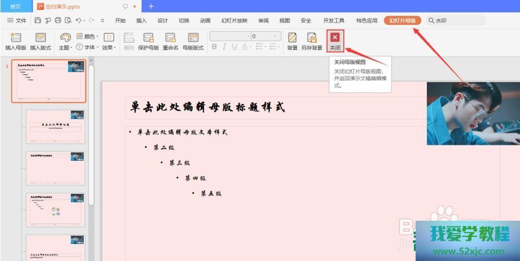 第三步:删除水印后,正在【幻灯片母版】下方单击【闭上】将母版视图闭上。水印就去掉了。如下图所示。