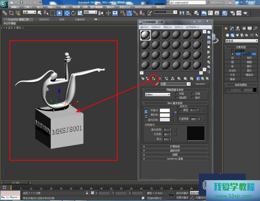 第2步点击【材质编辑器】,弹出材质编辑器修立栏,按图示参数修立一个白色材质球并附加给模子,考核并调理好模子(如图所示);