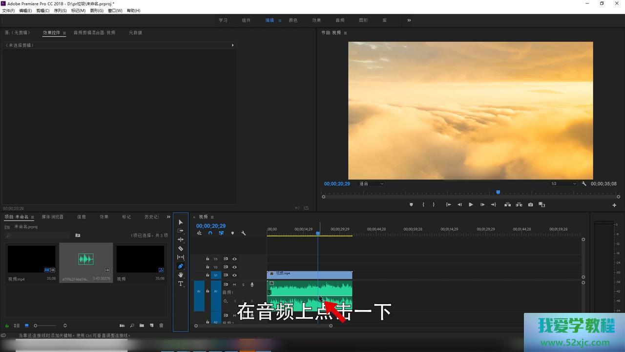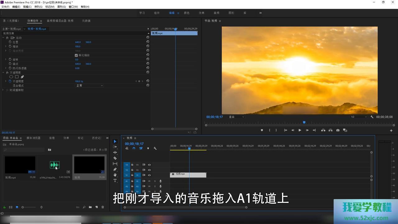 把导入的音乐拖到A1轨道上,挑选裁剪器械,对音乐举办裁剪,使音乐长度和视频相似。