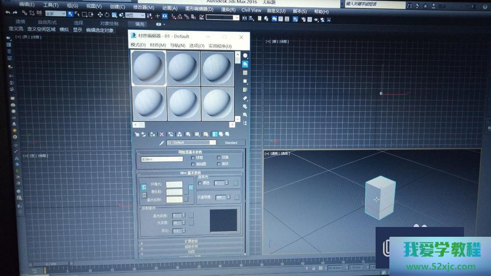 第2步遴选材质,火速键M,材质编辑器可能改成精简形式,将第一个材质拖到长方体上。