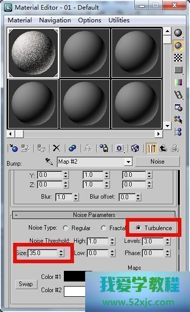 第4步正在弹出的【Nosie Parameters】(噪波参数)卷展栏中,选拔【Turbulence】(湍流)选项,筑立【Size】(巨细)为35,如下图所示。